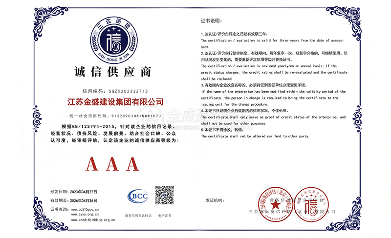 • 3A級資信等級證書